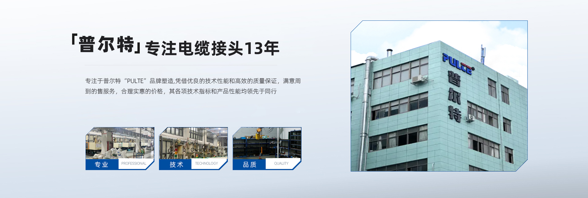普爾特電氣科技(溫州)有限公司是一家專業生產電纜接頭,防水接線盒的專業廠家,它誕生在"中國電器之都"柳市鎮,是一家集研發、生產、銷售于一體的專業化現代企業。 專注于普爾特“PULTE”品牌塑造,憑借優良的技術性能和高效的質量保證,滿意周到的售服務,合理實惠的價格,其各項技術指標和產品性能均領先于同行,廣泛應用于接線盒、配電柜、通訊設備、儀器儀表、醫療器械、機床機械等多個領域;不斷推陳出新,研發新品,形成多系列多品種的防水電纜接頭,防水接線盒,堵塞件,電纜接頭配件,軟管防水接頭等產品,有效拓寬了企業的市場渠道,增強了市場競爭力,為擴大企業規模奠定了基礎。       公司技術力量雄厚,由一批行業資深人士共同組建,在電纜接頭制造領域具有領先地位。 我們擁有完善的質量保證體系和豐富的設計制造經驗,以產品的高品質、高可靠性廣泛應用于各個行業,為全球需求者提供專業、高質量的電纜配套產品,相信在我們完整的系列產品中一定能有一款滿足您的需求。      公司始終堅持“為顧客創造滿意產品”的經營理念,以質量占領市場,以科技塑造品牌,不斷實現企業的持續向前發展。本公司可以根據客戶的要求,進行模具開發和生產。竭誠歡迎國內外新老客戶前來公司考察及洽談合作,共同創造美好的明天。 ...